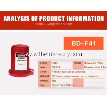 BD-F41 Brand: BOSHIPart code: BD-F41Color: Red (other colors can be customized)Material: PP (Flame-retardant materials can be customized)Weight: 58gSize: 79mm*79mm*84mmSuitable for Valve Diameter under 2.2cm