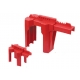 a.Made from polypropylene PP.b.Applied Sizes:a) BD-F01 locks out pipes from 13mm (1/2”) to 64mm (2 1/2”) in diameter.b) BD-F02 locks out pipes from 50mm (2”) to 200mm (8”) in diameter.c.Padlock locked shackle max diameter: 9mm.d.Color: red, other colors need to be customized.